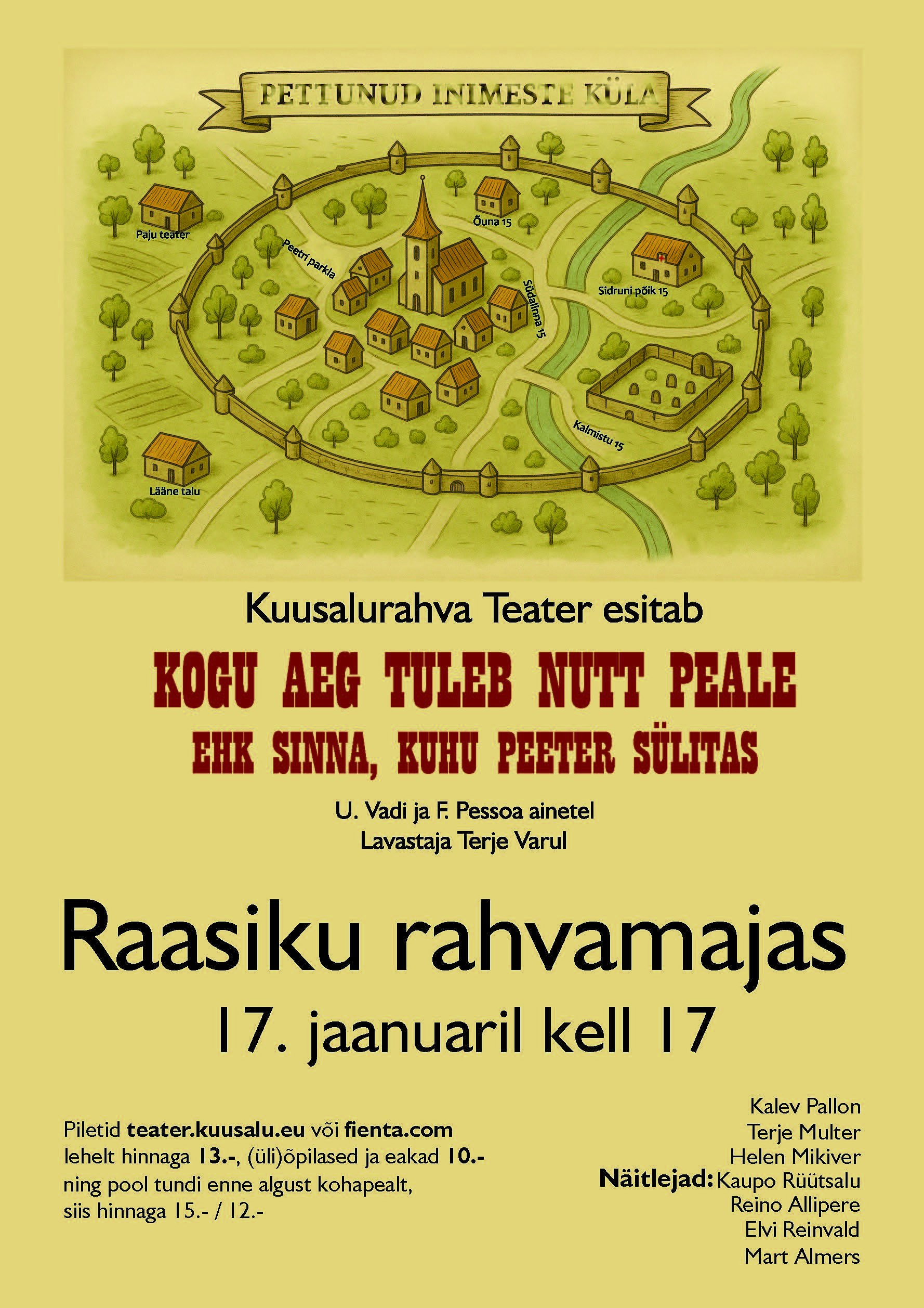 KUUSALURAHVA TEATRI ETENDUSTEATRIKOHVIK AVATUD ENNE ETENDUST KELL 16.30+ Add to Google Calendar+ iCal / Outlook export 00days 00hours 00minutes 00seconds Date17 Jan 2026 Time 16:30 - 18:30Järgmised üritused: CategoryEsitlusFilmKOGUPEREKontserdidNäitusedNoortekeskuse tegemisedõpitubaPiduspordivõistlusTeatertrennvaria January 2026 Jan 02 - 04LASTE TALVELAAGER Jan 15 2026AKRÜÜLMAALI TÖÖTUBA Jan 17 2026KUUSALURAHVA TEATRI ETENDUS No event found!