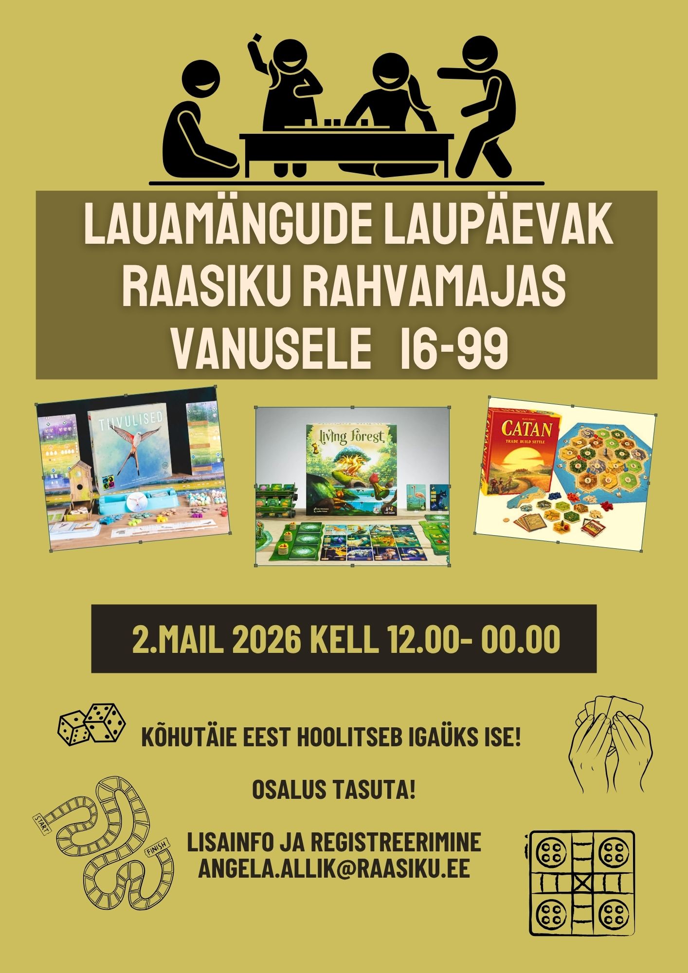 LAUAMÄNGUDE LAUPÄEVAK+ Add to Google Calendar+ iCal / Outlook export 00days 00hours 00minutes 00seconds Date02 May 2026 Time 12:00 - 00:00Järgmised üritused: CategoryEsitlusFilmKOGUPEREKontserdidNäitusedNoortekeskuse tegemisedõpitubaPiduspordivõistlusTeatertrennvaria April 2026 Apr 15 2026 - May 06 2026SÜDAMEKUU RAASIKUL Apr 19 2026TÄNA ÕHTUL PEETER OJA Apr 23 2026Raasiku Valla jüriööjooksMay 2026 May 02 2026LAUAMÄNGUDE LAUPÄEVAKJune 2026 Jun 01 2026RAASIKU MUSAFESTJuly 2026 Jul 13 - 19RaKu suvelaager No event found!