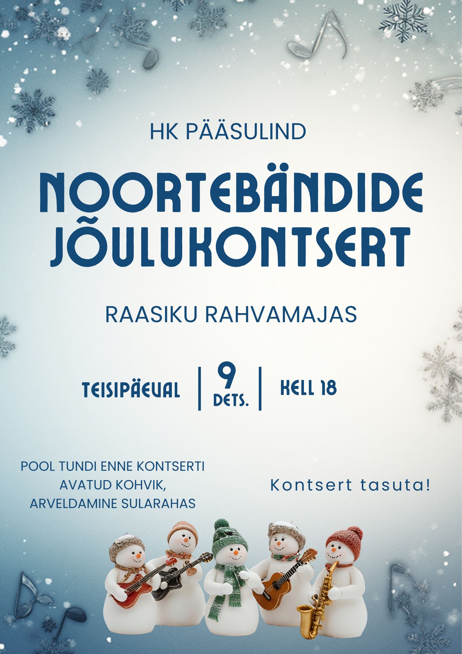 NOORTEBÄNDIDE JÕULUKONTSERT+ Add to Google Calendar+ iCal / Outlook export 00days 00hours 00minutes 00seconds Date09 Dec 2025 Time 18:00 - 19:30Järgmised üritused: CategoryEsitlusFilmKOGUPEREKontserdidNäitusedNoortekeskuse tegemisedõpitubaPiduspordivõistlusTeatertrennvaria November 2025 Nov 29 2025NÄITUS Nov 29 2025ADVENDIKONTSERTDecember 2025 Dec 04 2025TALLINKI NAISKOORI KONTSERT Dec 09 2025NOORTEBÄNDIDE JÕULUKONTSERT Dec 14 2025RAASIKU JÕULULAAT Dec 16 2025KODUSTE LASTE JÕULUHOMMIK Dec 19 2025NOORTE JÕULUBALLJanuary 2026 Jan 02 - 04LASTE TALVELAAGER No event found!